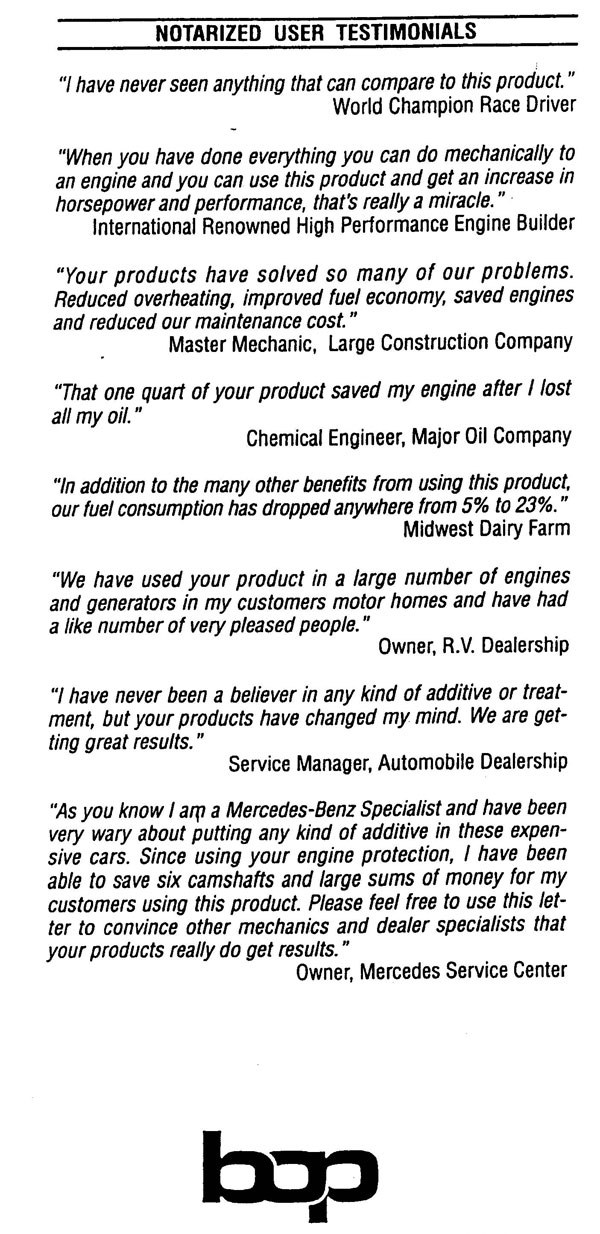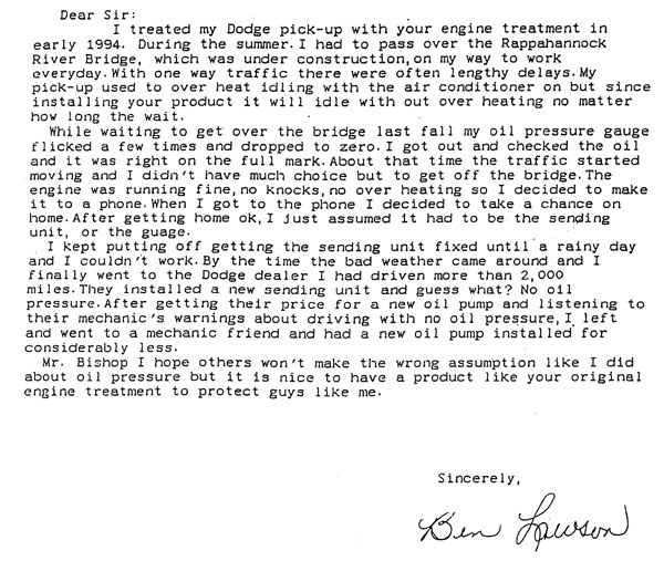 I am a fish spotter and fly the Chesapeake Bay area and along the eastern seaboard. We routinely put in between 1,200 and 1,500 hours a season on these light aircraft. Prior to using Bishop's Original, we were having considerable problems with valve guide wear which should cause a considerable overheating and stresses in the cylinders.