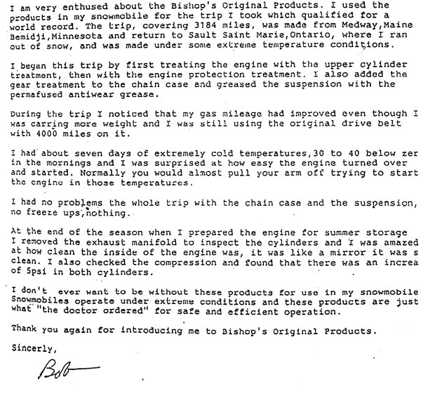 In 1994 I put a new engine on my aircraft and after sufficient break in, I used Bishop's Original Aircraft Engine Protection. Since then, I have flown the aircraft over 3,500 hours.